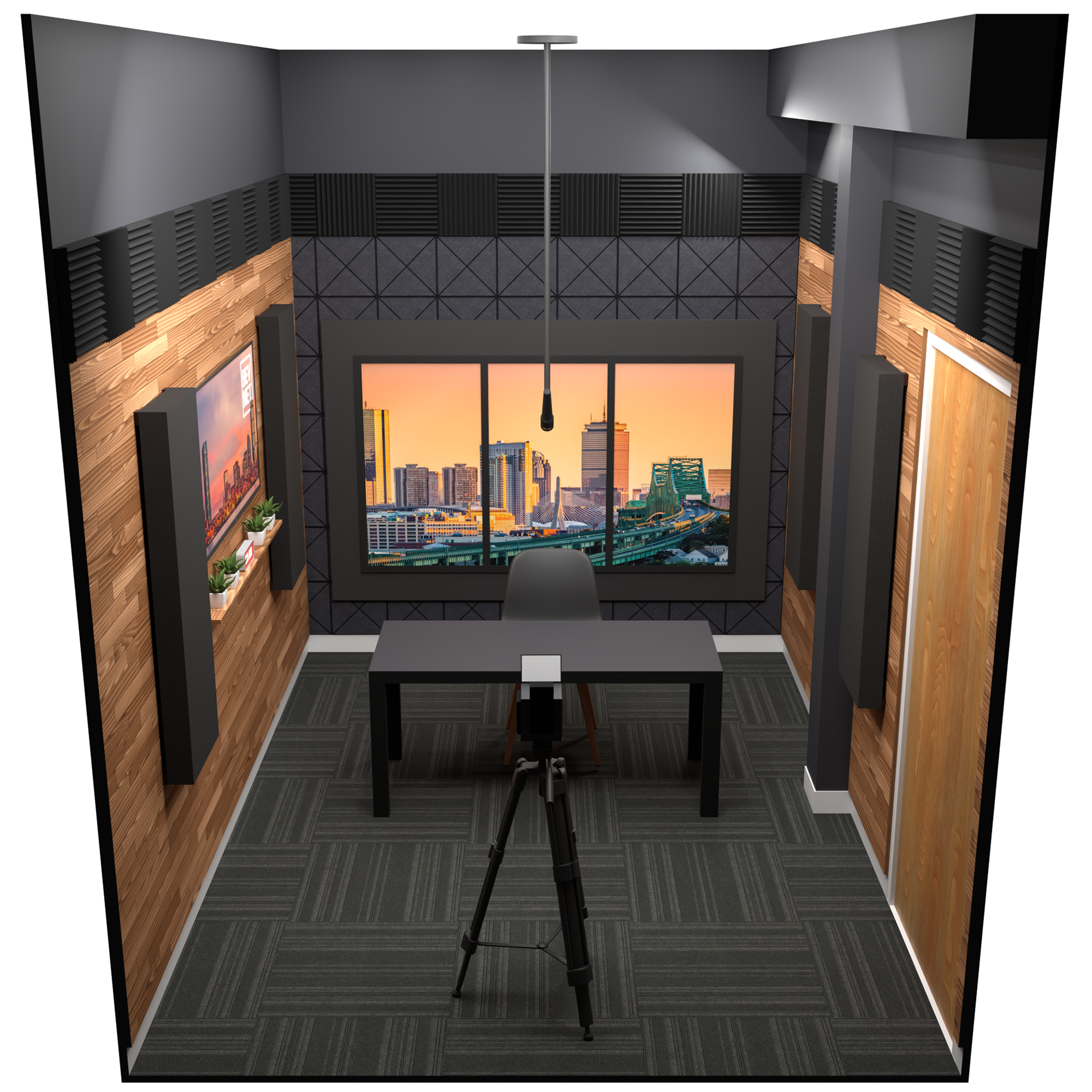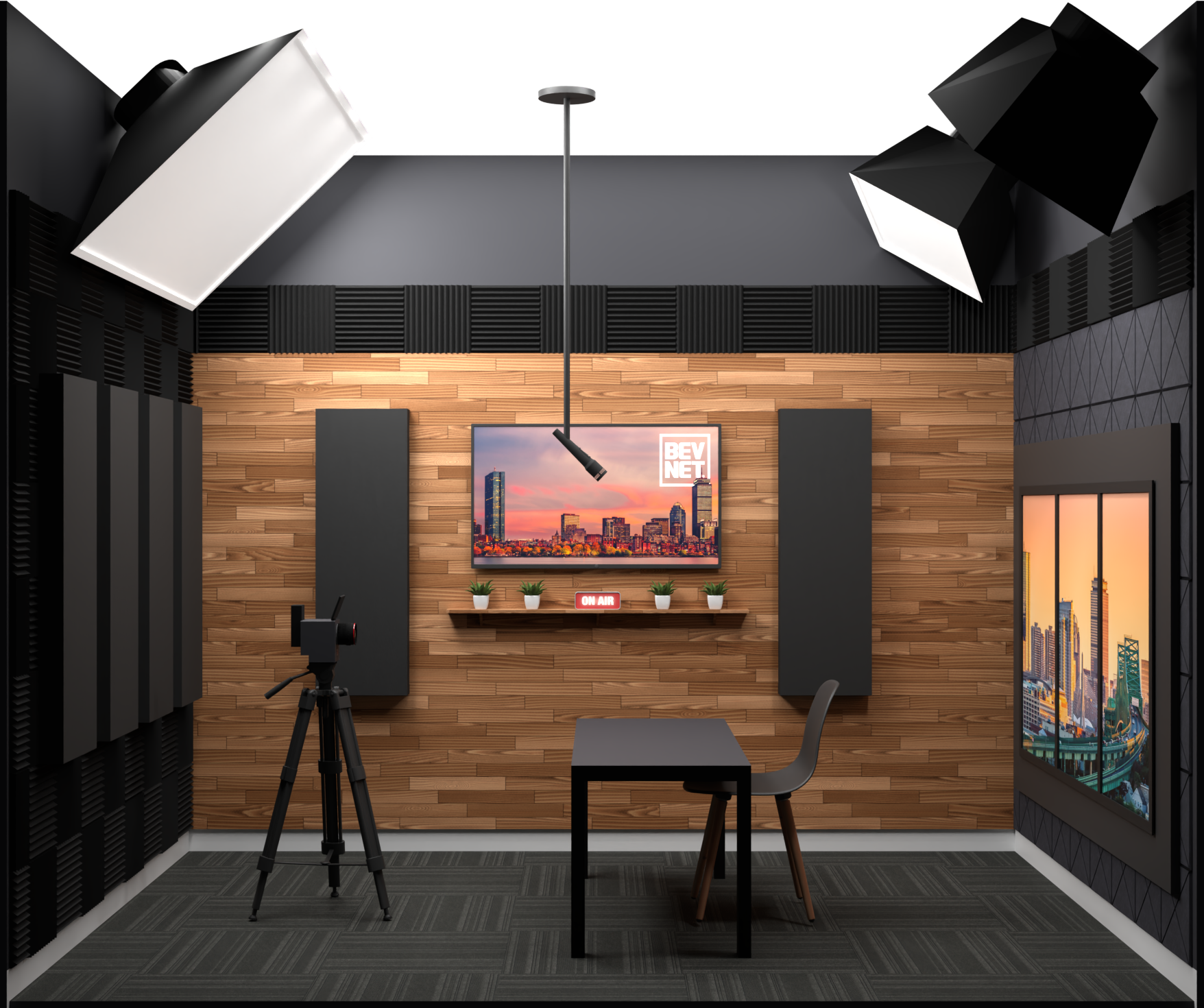 I designed, built, and operated Studio 2 as a remote interview space that could accommodate different podcasts and branding. The three TVs in the background were meant to function as a kind of virtual window where we could insert neutral, often Boston-centric, landscapes as in a newsroom. Remote guests appeared on the host’s teleprompter. The rest of the room was sound treated with acoustic foam and handmade acoustic panels. A/V was run to and from the central control room where I monitored and adjusted the cameras, audio levels, and feed.